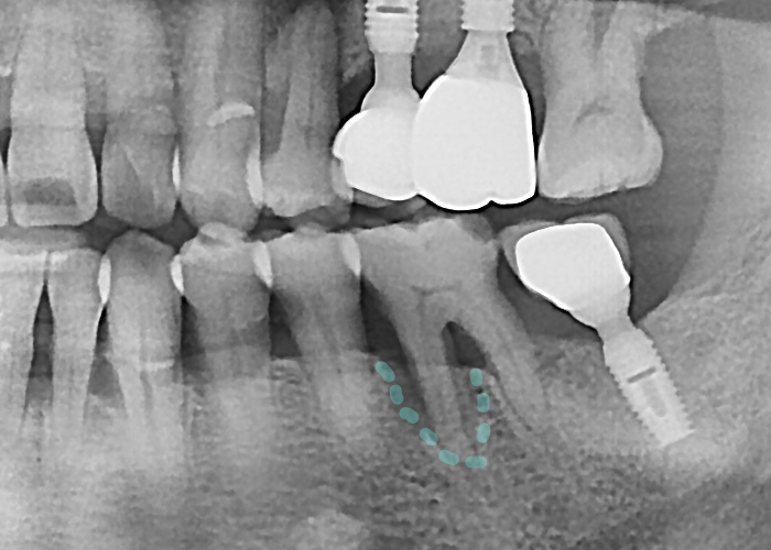 2년 정도가 경과하게 되면 방사선 사진에서 뿌리 주변의 뼈가 점차 줄어들고, 뿌리 일부가 드러나기 시작합니다.