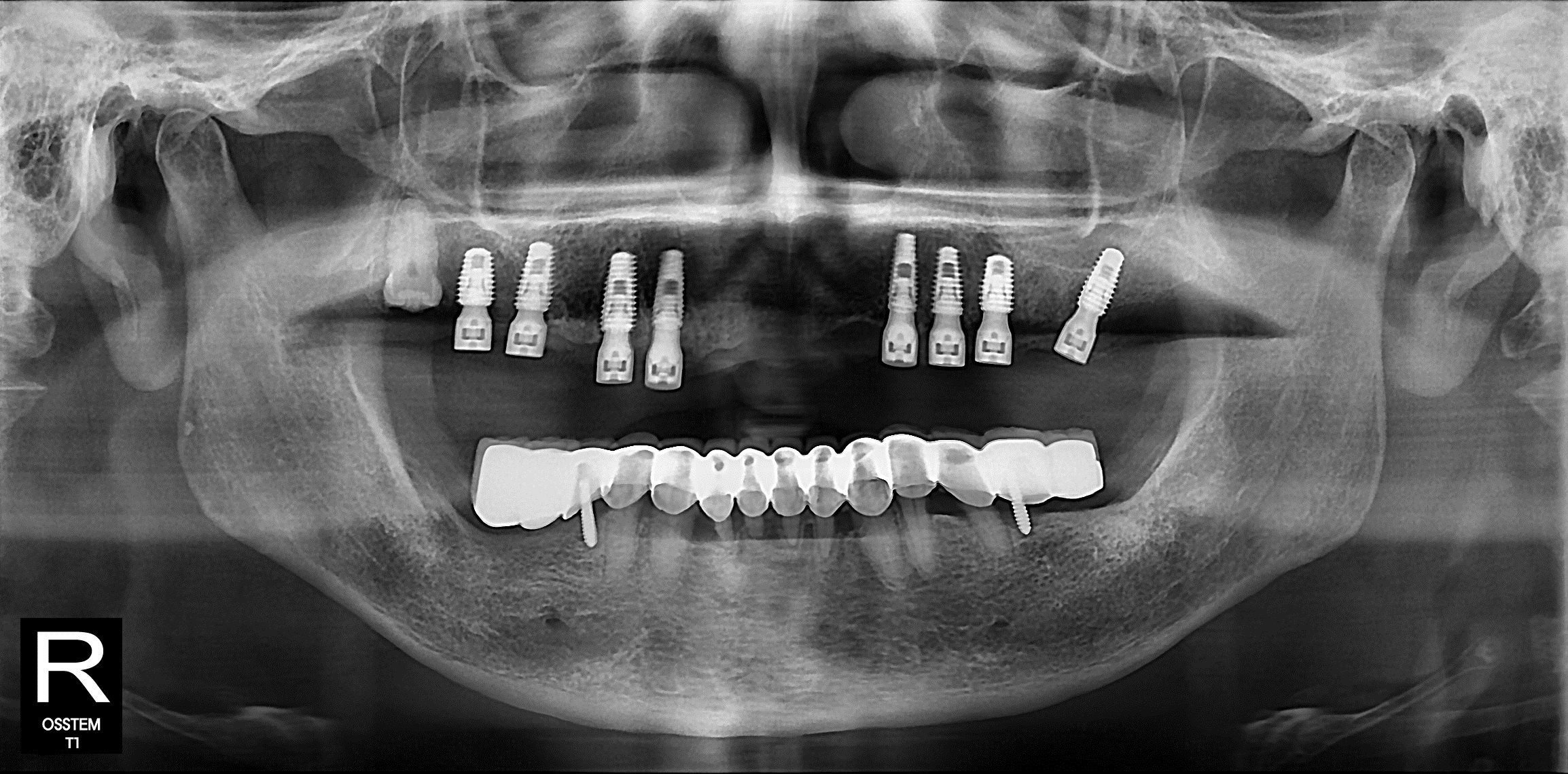 남아 있는 잇몸뼈를 기준으로 양쪽 소구치와 대구치 부위에 총 8개의 임플란트를 식립했습니다.